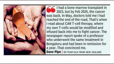 Bengaluru: For New Zealander Dave Pipe, it was perhaps a last shot at life. The 69-year-old from Christchurch, who had been battling multiple myeloma for years, found fresh hope in the unlikeliest of places — a newspaper article on Bengaluru’s medical expertise!The story was about a fellow Kiwi who had travelled all the way to Bengaluru for CAR T-cell therapy and gone into remission. For Pipe, who had already endured 20 cycles of chemotherapy and a stem cell transplant, it felt like the only ray of hope left.“In New Zealand, laws don’t allow doctors to recommend treatments outside the country since care is covered under public health. I had a bone marrow transplant in 2023, but remission lasted only 14 months. By Feb 2025, the cancer was back. A new drug was tried but it failed, and by May, doctors told me I had reached the end of the road,” Pipe recalled. “That’s when I read about CAR T-cell therapy, where my own T-cells would be modified and infused back into me to fight cancer. The newspaper report spoke of a professor who underwent the same treatment in Bengaluru and had been in remission for a year. That convinced me,” he explained.Soon after, Pipe reached out to Dr Prasad Narayanan, senior consultant and director of medical oncology, hemato-oncology and bone marrow transplant at Cytecare Hospitals, Yelahanka, to begin discussions. After the initial chemo and final Car-T infusion in the city, Pipe said: “It was an anticlimax. Doctors asked me how I felt. I felt bored and only stared at the nine faces that were surrounding me,” he laughed, thanking Bengaluru’s medical specialists.Robotic cardiac proceduresCity hospitals across the board are seeing patients coming in from abroad for advanced treatments. In the past three years alone, 93 patients came to Sakra World Hospital from outside India for robotic cardiac surgeries. “While conventional open-heart surgery typically requires 8-10 days of hospital stay and 2-3 months for full recovery, patients at Sakra undergoing robotic cardiac procedures are often discharged within 3-4 days, with most returning to normal life in 2-3 weeks,” said hospital representatives.