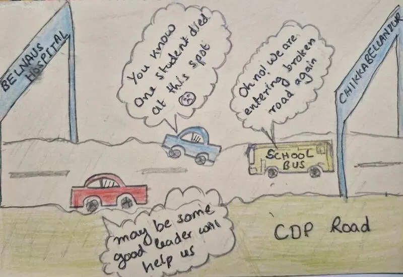 Bengaluru: Tired of enduring dangerous and potholed roads, a group of school students from Carmelaram and Chikkabellandur has written letters and sent posters to deputy chief minister DK Shivakumar, seeking their immediate repairs.The children highlighted their struggles on key stretches such as Gear School Road, Varthur Main Road, Carmelaram Railway Station Road and the half-built 100ft Road. They also flagged the long-stalled Carmelaram railway overbridge project, which has worsened traffic snarls.Local residents say the villages were merged with BBMP in 2008, but basic infrastructure like proper roads remains absent. Daily commuters report waterlogging, safety risks, and frequent accidents. The students, who came together during a regular letter-writing session, said they were compelled to act after seeing buses bump dangerously on cratered roads, causing injuries to commuters.The 5-km stretch from Outer Ring Road (ORR) to Carmelaram takes up to 1.5 hours to cross because of narrow lanes and poor maintenance. The stalled overbridge at the railway station adds to the gridlock, leaving thousands of commuters stranded daily.Preethi Aswani, 45, a tech professional, said travelling on the stretch is a daily ordeal. “During rains, you can’t tell where the road ends and where the lake begins—it’s completely waterlogged. My senior citizen parents struggle, and even autos refuse to ply. We often spend Rs 200–250 on cabs for very short distances. A college student even lost his life here. Authorities only put up caution boards and humps, but no real solution has come.“Citizen activist Jose Thazhathuveettil of Carmelaram Unite said the problem is a result of rapid growth without proportional road development. “The 5-km stretch from Outer Ring Road to Carmelaram takes 1.5 hours. Despite being under BBMP since 2008, roads remain incomplete. Officials must prioritise completing CDP (comprehensive development plan) roads to ease congestion.”The students added that travelling to school has become risky. Many said they hold tightly inside buses to avoid falls during the bumpy rides. One postcard read: “Every day we are scared to travel on these roads. Sometimes we get hurt inside the bus. Please fix them before more accidents happen.”The community hopes that the children’s initiative will draw the DCM’s attention to the state of Carmelaram’s crumbling infrastructure and force BBMP to take up repairs without delay.—–Quotes With Mugs:Children’s take on ORR-Carmelaram RoadThe 100ft road near us has been incomplete for three years, causing many accidents. A few of us started sending postcards to the deputy CM asking for real, long-term solutions-Ezzah CT, class 10—-Scooters fall here every day. Once our bus hit a pothole and my friend was badly hurt. It’s scary now. I just want officials to finally fix the CDP Road-Ojas Haswani, class 3—-A long stretch of the road is still not hardened, (it’s) full of potholes. Our buses shake so much that students fall, and traffic delays us. I asked for proper repairs-Catherine Antony, class 7—This road is dusty, bumpy and full of potholes. Our bus moves slowly, and once I got hurt when it braked suddenly. Good roads would make travel safer and faster-Nirvi Gehlot, class 3