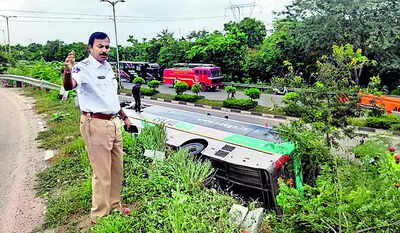 HYDERABAD: Just a day after a private bus fire charred to death several passengers in Andhra Pradesh’s Kurnool, another mishap involving a private bus was reported on the outskirts of Hyderabad Saturday afternoon. A NueGo electric bus going to Guntur in Andhra Pradesh from Telangana’s Miyapur, overturned near Pedda Amberpet toll plaza around 12.35pm, after the driver lost control of the vehicle while driving rashly, police said. The bus was carrying six passengers, two drivers, and a conductor at the time of the accident. The vehicle hit the median before overturning, leaving several occupants injured. Fortunately, there were no casualties, and no traffic disruption was reported in the area, police said. “All the victims suffered minor injuries, and they are out of danger,” Abdullapurmet inspector V Ashok Reddy said. Police have registered a case under sections 125(a) (for causing hurt by an act endangering human life), and 281 (rash driving on a public way) of BNS. An investigation is underway to determine the exact cause of the accident. Authorities have urged private transport operators to adhere to road safety regulations.